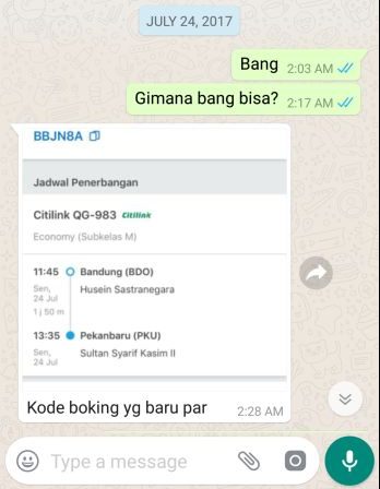 Bermodal nekat, saya pergi ke bandara diantar oleh salah seorang rekan pemilik hotel tersebut, sambil di jalan tidak henti-henti merefresh halaman jadwal berharap ada yang cancel tiketnya atau secara ajaib tiba-tiba kursi di pesawat nambah satu. Gerbang bandara sudah terlihat, saya bingung ketika driver bertanya flight jam berapa, karena memang belum punya tiket. Saya cuma jawab “Tar agak maleman bang..”. Melewati gerbang bandara, menuju parkiran, tiba-tiba muncul 1 seat kosong untuk penerbangan Pontianak-Jakarta yang tentu langsung saya ambil. “Rejeki iioo, papihnya bisa pulang malam ini nemenin” pikir saya. Langsung pesan tiket, dan bayar dengan metoda pembayaran online yang tersedia. Saat itu saya pilih menggunakan kartu kredit, walaupun banyak disediakan juga metoda pembayaran lain yang juga mudah digunakan tanpa harus mengantri atau transfer manual.