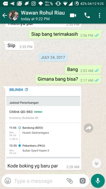 “Par, tadi pak bos udah oke, kamu berangkat lusa ya. abang pesankan tiket pesawatnya. Pake traveloka aja biar gampang, kamu kirim foto KTP ke WA abang”. Begitulah pembicaraan singkat dari Bang Wawan, seorang sahabat dari Rokan Hulu, sebuah kabupaten di provinsi Riau, Sumatera. Masih teringat jelas waktu itu, sore hari pada sabtu tanggal 22 Juli 2017. Keesokan harinya, berhubung hari minggu, saya habiskan waktu untuk bermain bersama iio sambil mempersiapkan peralatan dan barang bawaan yang akan dibawa terbang ke sumatera keesokan harinya. Seperti biasa entah kebiasaan atau apa, malam harinya selalu tidak bisa tidur.. sekitar jam 11 malam, daripada bengong ga jelas, mending web check ini. memanfaatkan fasilitas canggih yang disediakan maskapai penerbangan biar nanti di bandara ga usah antri-antri lagi, toh saya biasanya kalo pergi sendiri ga pernah bawa bagasi. Cukup 2 tas, satu untuk pakaian, satunya peralatan kerja saja.