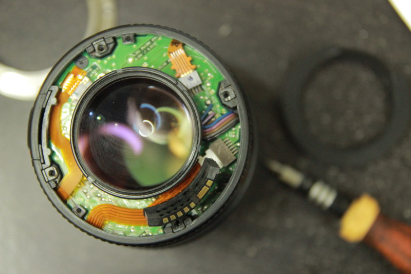 Pada tahap awal, selalu lakukan percobaan dengan menggunakan lensa pada body kamera lain untuk memastikan masalah utamanya bukan di kamera yang kita biasa gunakan. Lalu perhatikan juga pin-pin konektor pada lensa agar dibersihkan dan terhindar dari debu serta kotoran yang mengganggu kelancaran komunikasi antara lensa dan kamera. Lalu saya mencoba memutar manual ring fokus lensa untuk memastikan bukan masalah mekanik yang terjadi. Setelah memastikan memang benar masalahnya ada di dalam lensa, saya beranikan diri untuk membuka lensa ini ( bagi yang memiliki lensa yang masih garansi sebaiknya bawa ke service center resmi ya, buka lensa menghanguskan garansi )