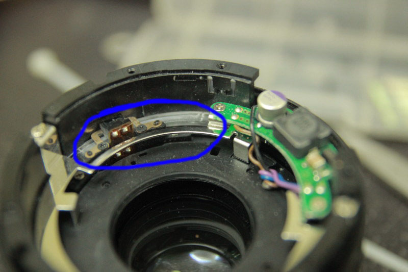 Sampai di dalam, saya coba bersihkan semua bagiannya. Saya menemukan sebuah strip agak transparan (lingkaran biru pada gambar) yang ikut berputar jika ring fokus saya putar, sepertinya bagian dari sensor posisi fokus lensa. Saya coba bersihkan bagian ini dengan cutton bud dan cairan pembersih kacamata, dan ajaibnya, dari warnanya putih seperti di gambar, berubah jadi transparan.