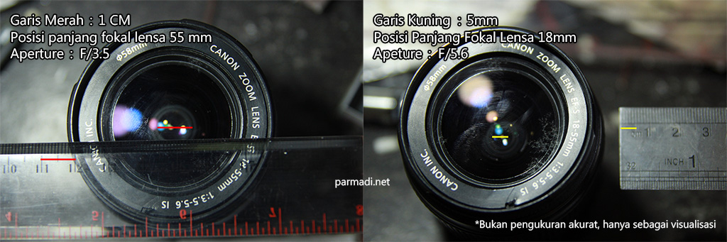 - Apabila kita menggunakan lensa zoom yang besaran bukaan terbesarnya mengikuti panjang lensa (seperti misalnya “Canon EF-S 18-55mm f/3.5-5.6 IS II“), kita harus berhati-hati ketika melakukan zooming, karena jika pada posisi zoom terlebar kita menggunakan f/3.5, ketika kita melakukan zooming, bukaan lensa akan mengecil hingga f/5.6 pada posisi zoom tersempit. hal ini akan menghasilkan 2 hal berikut.