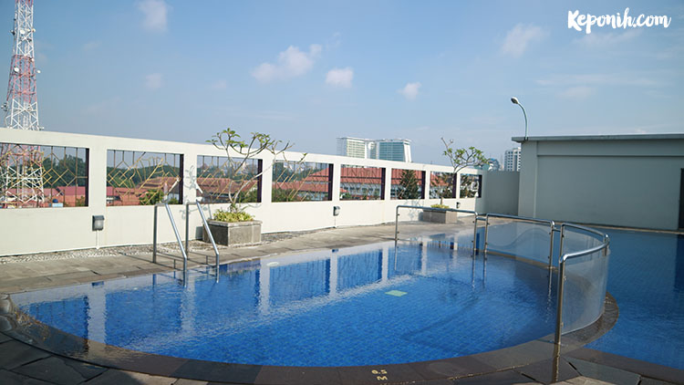 Naik menuju lantai 6, dengan pakaian yang sudah siap nyemplung ke kolam renang. Pagi setelah sarapan di restonya kami bergegas menuju lantai atas untuk memuaskan hasrat berenang iioo. Cuacanya bersahabat banget, kolamnya terdiri dari 2 kolam yang dipisah dengan pagar kaca transparan, terdiri dari 1 kolam anak ( dalamnya mungkin hanya 70cm an ) dan kolam dewasa yang ukurannya lebih besar. Bentuk kolam ini tidak kotak seperti kolam kebanyakan. Airnya dingin, tapi kalau hari cerah banget dan berenang agak sore, airnya bisa jadi anget karena memang kolam renang outdoor beratapkan langit.