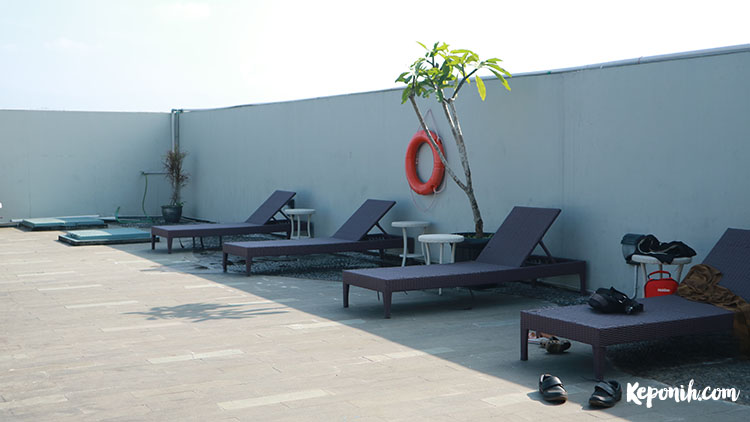 Di pinggir kolam ada tempat duduk untuk berjemur, saya memilih untuk berjemur dan melihat iioo dan papi dari kursi aja. Begini saja udah bahagia hati saya ini, dari lantai 6 ini pun kita bisa melihat Bandung dari atas, gedung – gedung di tengah kota Bandung yang kini sudah padat. Di lantai ini pun terdapat resto/cafe, sayangnya pas ke sini sedang tutup.