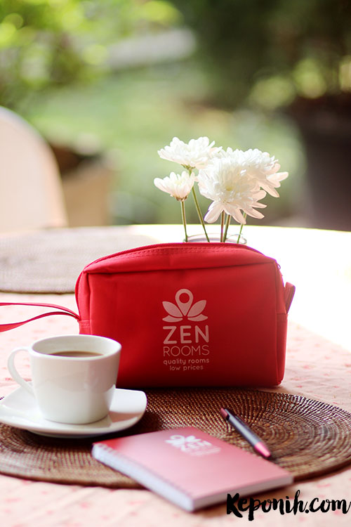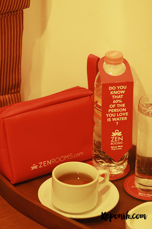 Di kamarnya ada pernak pernik keren berwarna merah, diantaranya tambahan bantal merah dengan logo ZEN Rooms, juga mineral water dengan packing khas ZEN Rooms, alas gelas ZEN Rooms, gantungan pintu ala ZEN Rooms, juga pouch yang bertengger sebelah TV, kepo isinya apa ? Ini dia : hand sanitizer, handuk kecil, 2 sikat gigi, pulpen, notebook mini, dan 1 voucher potongan harga 10% untuk next staycation. Aseeeek.